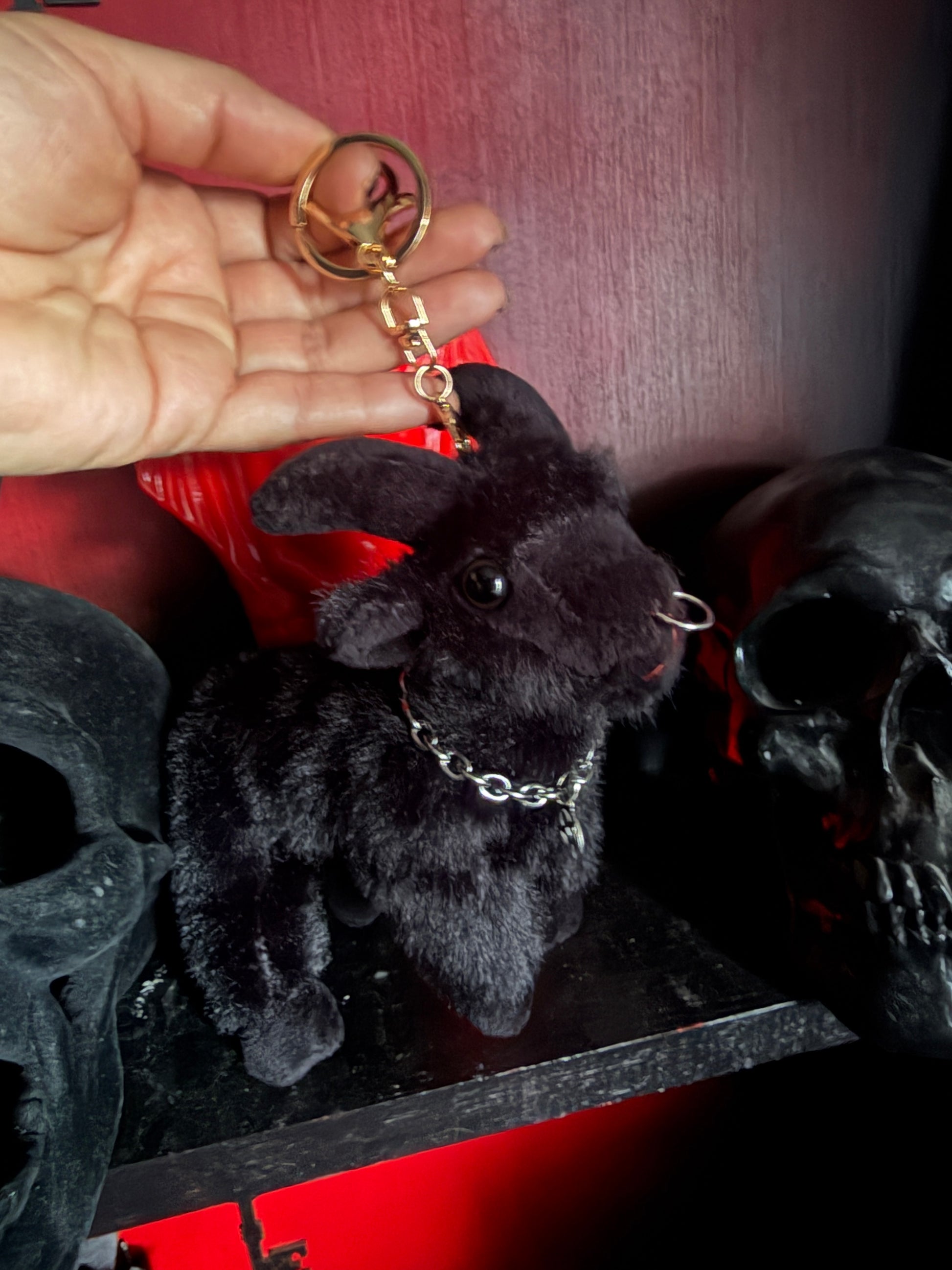 Make a blood pact with this adorable super soft devil goat plushy. This new darkly whimsical companion has pierced nose and a necklace with an upside down pentagram. It measures 7 Inches long and 6 inches tall. Super soft goat plushie keychain that can be worn on totes, purses and bags.