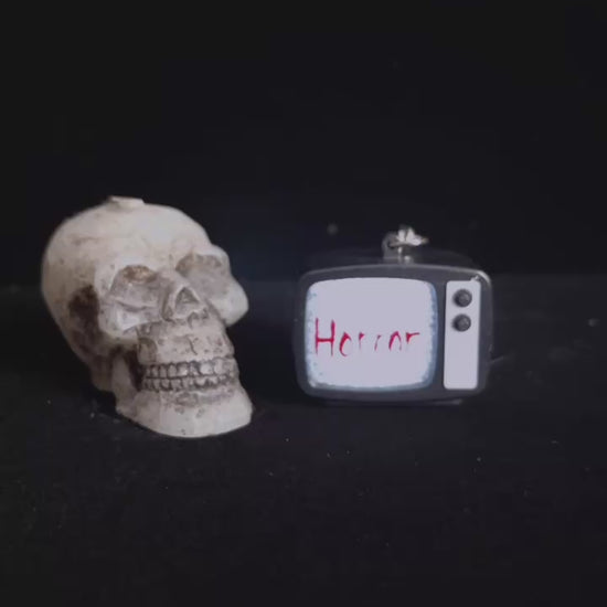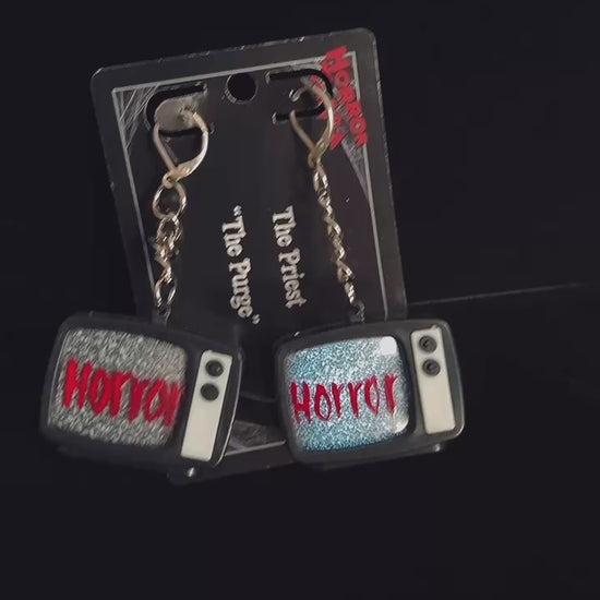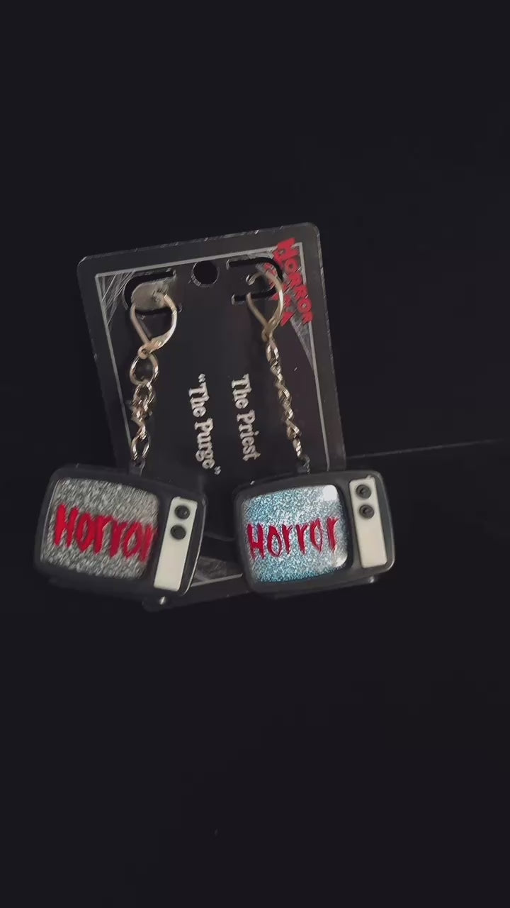 These mini tv's are custom made. They are hand painted Horror on the screen. Font will vary since I hand paint them. My logo is on the back of the tv's. There's a button on the front that you can push and the tv will light up with white noise. The battery can be replaced. You will need a small screwdriver to open the tv. The battery is AG 10. The earring hoop is a french lever style. Hypoallergenic. The earrings aren't too heavy.